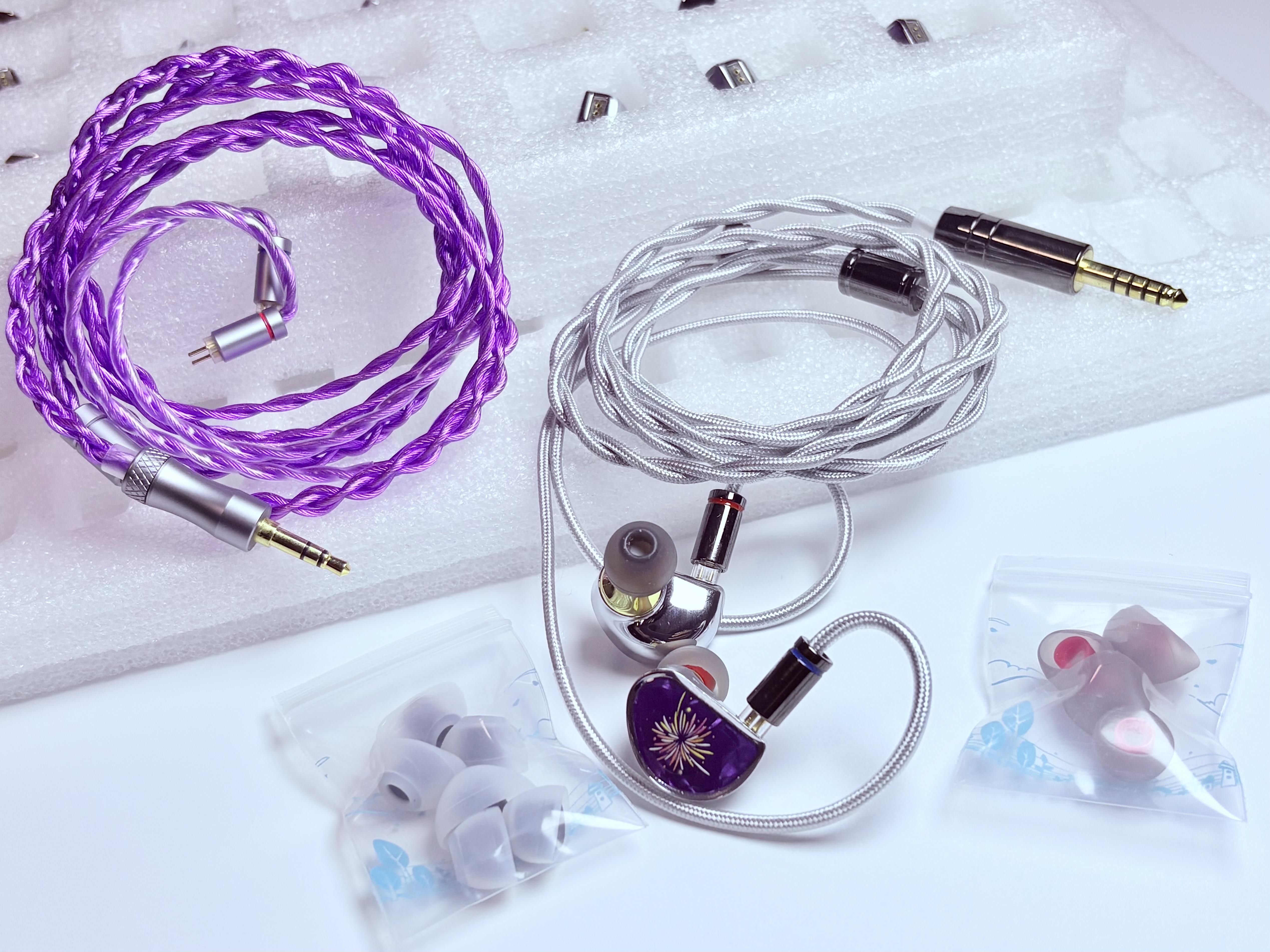 (2)音楽鑑賞用ケーブル(グレー): 花火を基調とした『Hanabi II』 の特性 (質感ある低音、豊かな高音、情感ある中音) を活かしつつ、様々な音楽ジャンルでバランスの取れた、没入感のある鑑賞を可能にします。特に中域の自然さと全体的な調和を重視したチューニングです。